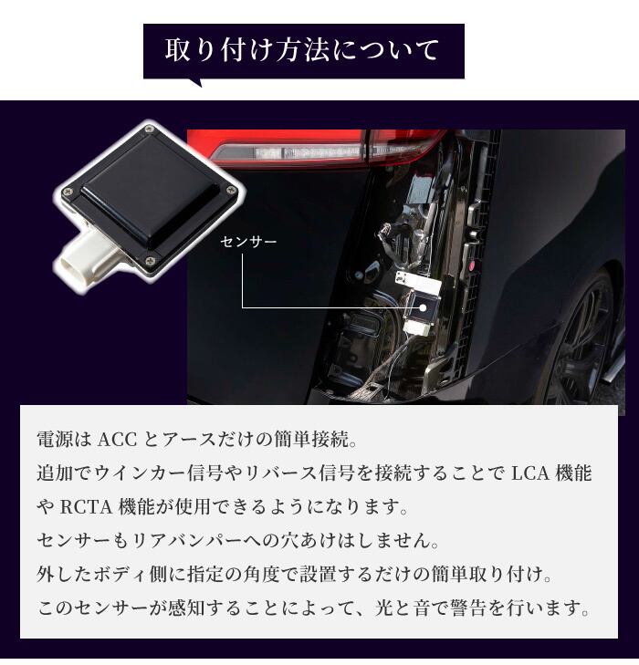 センサーもリアバンパーへの穴あけはしません。外したボディ側に指定の角度で設置するだけの簡単取り付け。このセンサーが感知することによって、光と音で警告を行います。