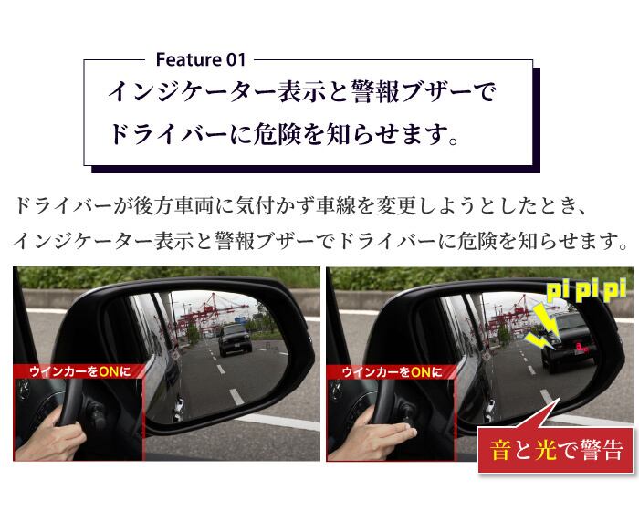ドライバーが後方車両に気付かず車線を変更しようとしたとき、インジケーター表示と警報ブザーでドライバーに危険を知らせます。