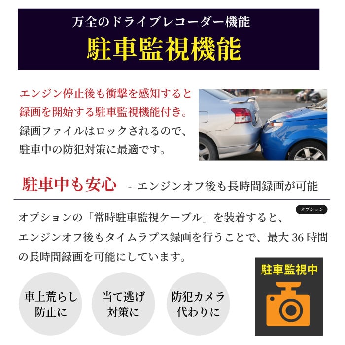 ・駐車監視 4時間/12時間/24時間/48時間 (※オプションケーブルDRMR-OP2-011必要)