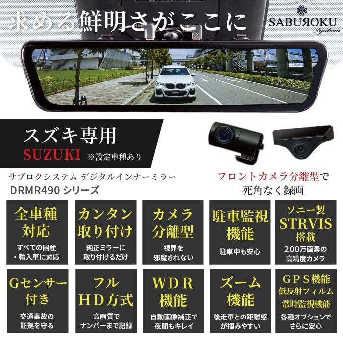 デジタルインナーミラー DRMR490(本体+アーム)【スズキ専用】 [ ドライブレコーダー ミラー製 ミラー型 車内 カメラ 分離型 ドラレコ ミラー型 ドラレコ デジタルインナーミラー 駐車監視 ドラレコ 前後 前後2カメラ 12インチ 前後同時録画 衝撃検知 ]